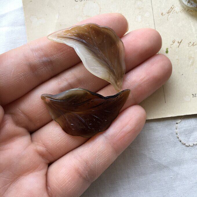 【2粒】37×21mm/ミルキーダークカーキマーブル/リーフパーツ