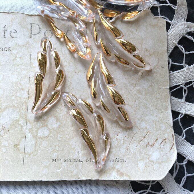 【4粒】40×15mm/クリア×ゴールドペイントリーフパーツ